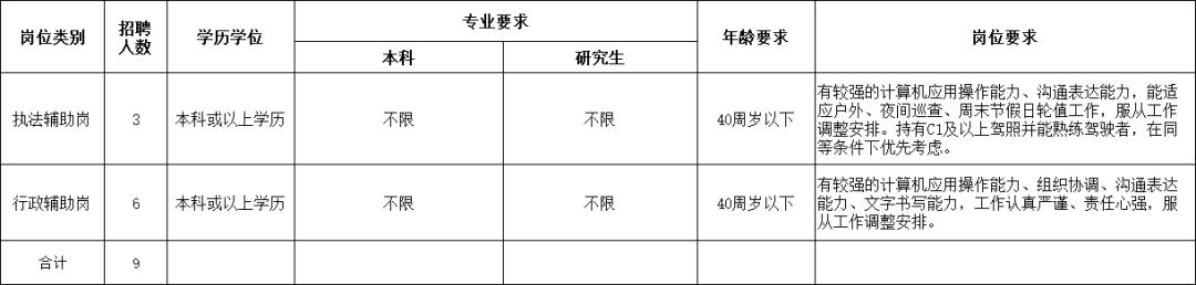 本次面向社会公开招聘9名政府雇员,其中执法辅助岗3名、行政辅助岗6名。
